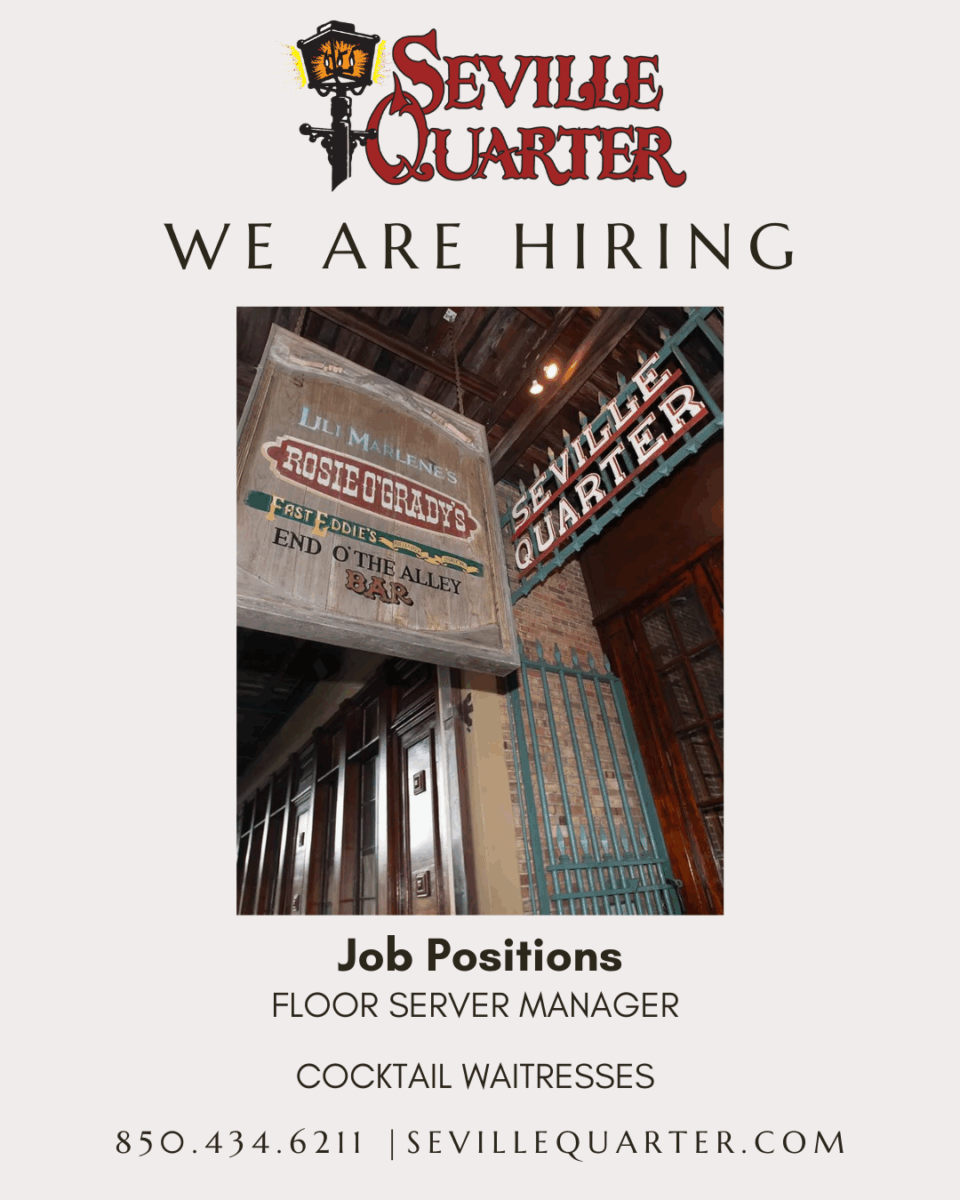 TO APPLY: Seville Quarter Administrative Offices — Monday – Friday — 10:00 AM – 4:00 PM